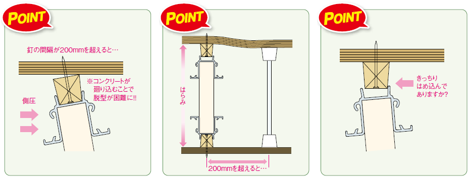 | 木目地棒をご使用いただき(釘N45・@200mm以下で固定)、コンクリート打設条件を厳守いただくことで、補強金具なしでの施工が可能です。 |