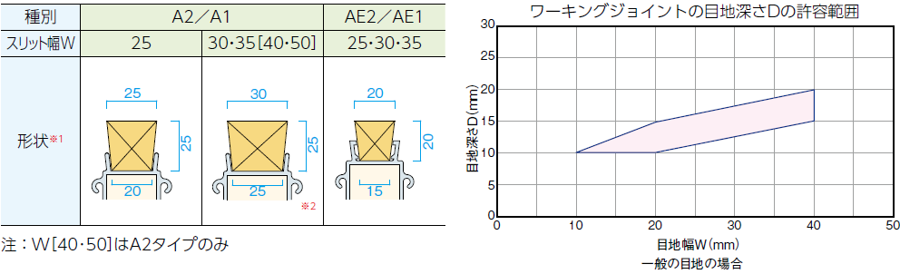 | 標準目地棒以外の高さの目地棒をお使いの場合は、ワーキングジョイントにおけるシーリング深さが確保出来ない場合があります。 右上図は、JASS8によるワーキングジョイントの2面接着の許容範囲を示したもので、この範囲から外れた場合は、接着面積の不足あるいは過大によるシーリングのはく離、硬化遅延、表面劣化等の損傷が生じる危険性があります。(詳細は、技術資料の「防水性能」をご参照ください。) |