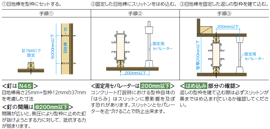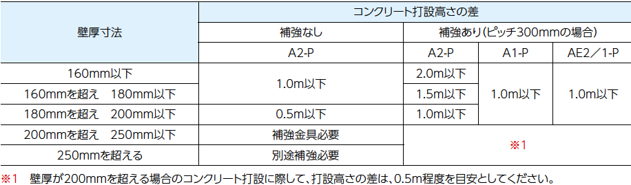 ※1 木目地棒をご使用いただき(釘N45・ @200mm以下 で固定)、コンクリート打設条件を厳守いただくことで、