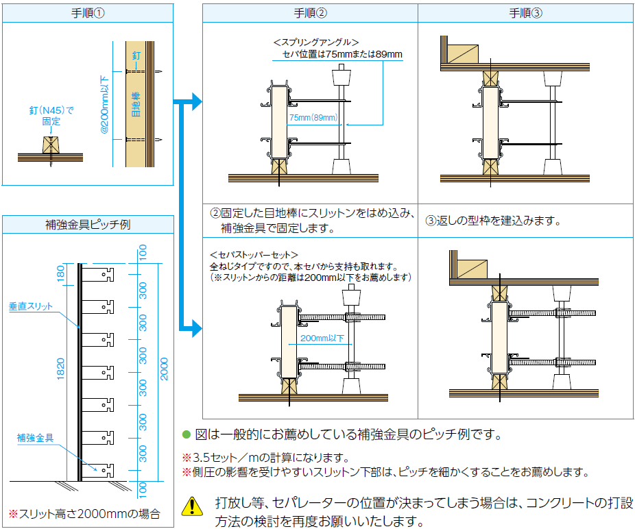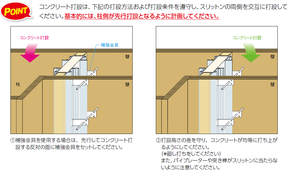 | 開口下に設けるスリット(腰壁など)はコンクリートの打設条件が厳しくなることが多いので補強金具のピッチは300mm以下を厳守してください。 |