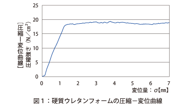 | 試験 | 試験方法 | 1.圧縮性能試験は、JIS K 7220(2006)「硬質発泡プラスチック-圧縮特性の求め方」に準じて、 20±2℃及び60±2℃において、圧縮速度1.0㎜/minで、0~30%の圧縮を行う 。2) |