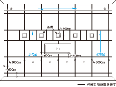 成形伸縮目地材 (1)形状及び寸法 目地幅は25㎜、本体は目地幅の80%以上、保護コンクリートの上面から下面にまで達するよう高さの調整が可能なもので、キャップ側面に付着層又はアンカー部を備えた製品とする。 (2)平場の屋根防水保護層には、伸縮調整目地を設ける。伸縮調整目地の割付けは、周辺の立上り部の仕上り面から600㎜程度とし、中間部は縦横間隔3,000㎜程度とする。また、伸縮調整目地は、排水溝を含めて、立上りの仕上り面に達するものとする。 |