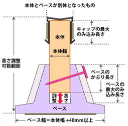 a: 高さ可変範囲 b: キャップの最大のみ込み長さ c: 15mm(最低限度必要なキャップのかぶり長さ) d: ベースの最大のみ込み長さ e: 10mm(最低限度必要なベースのかぶり長さ) |