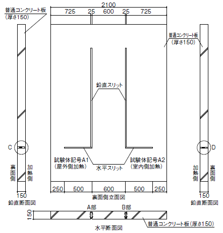 加熱中及び加熱終了後において、鉛直スリット及び水 平スリット共に裏面側(非加熱側)での火炎の発生及び 亀裂等で貫通する隙間は認められなかった。