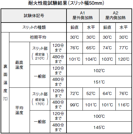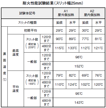 ※上記以外のスリット幅30mm、35mm、40mmにおいても、同様の試験を実施し耐火性能を確認しています。